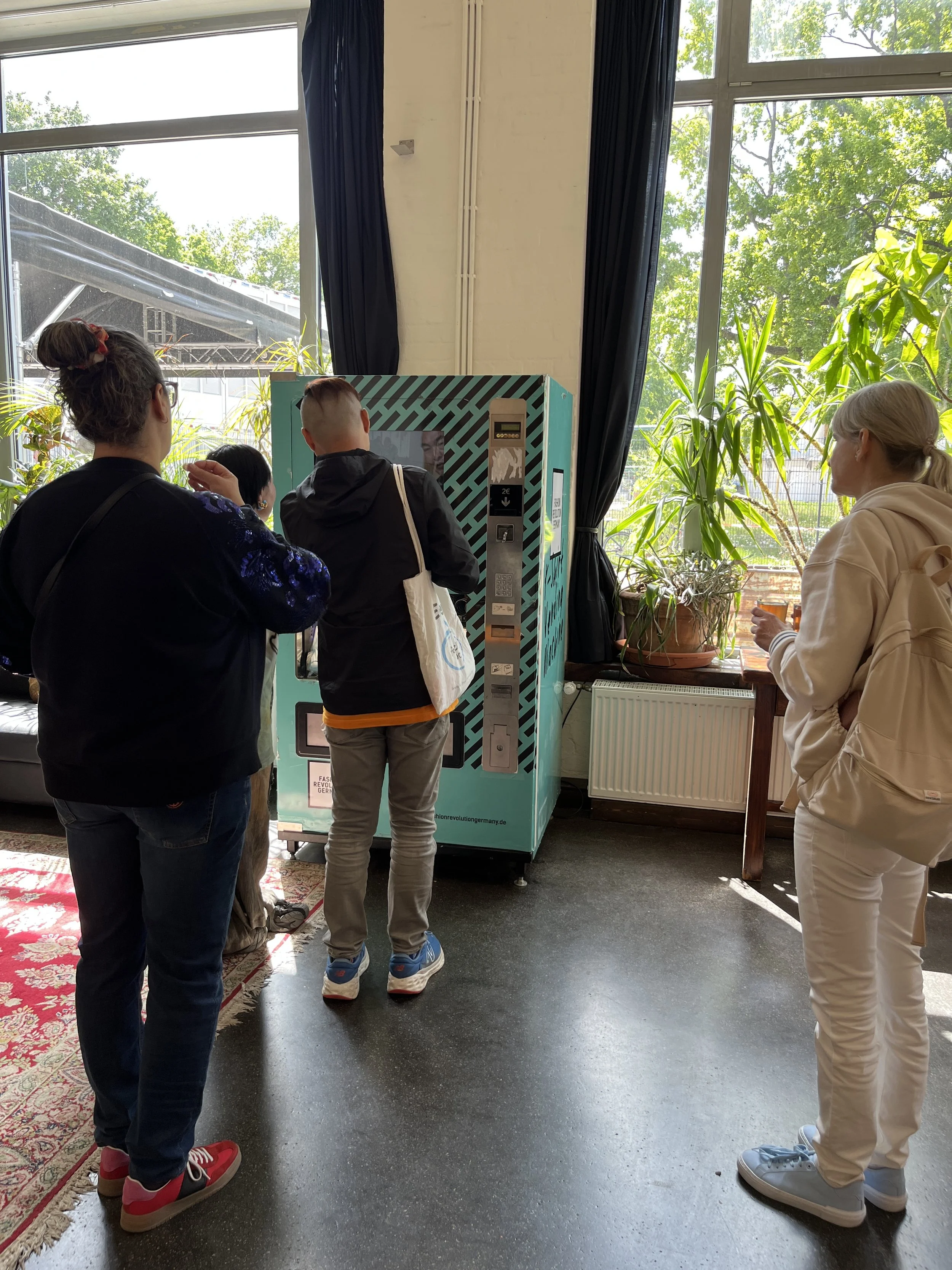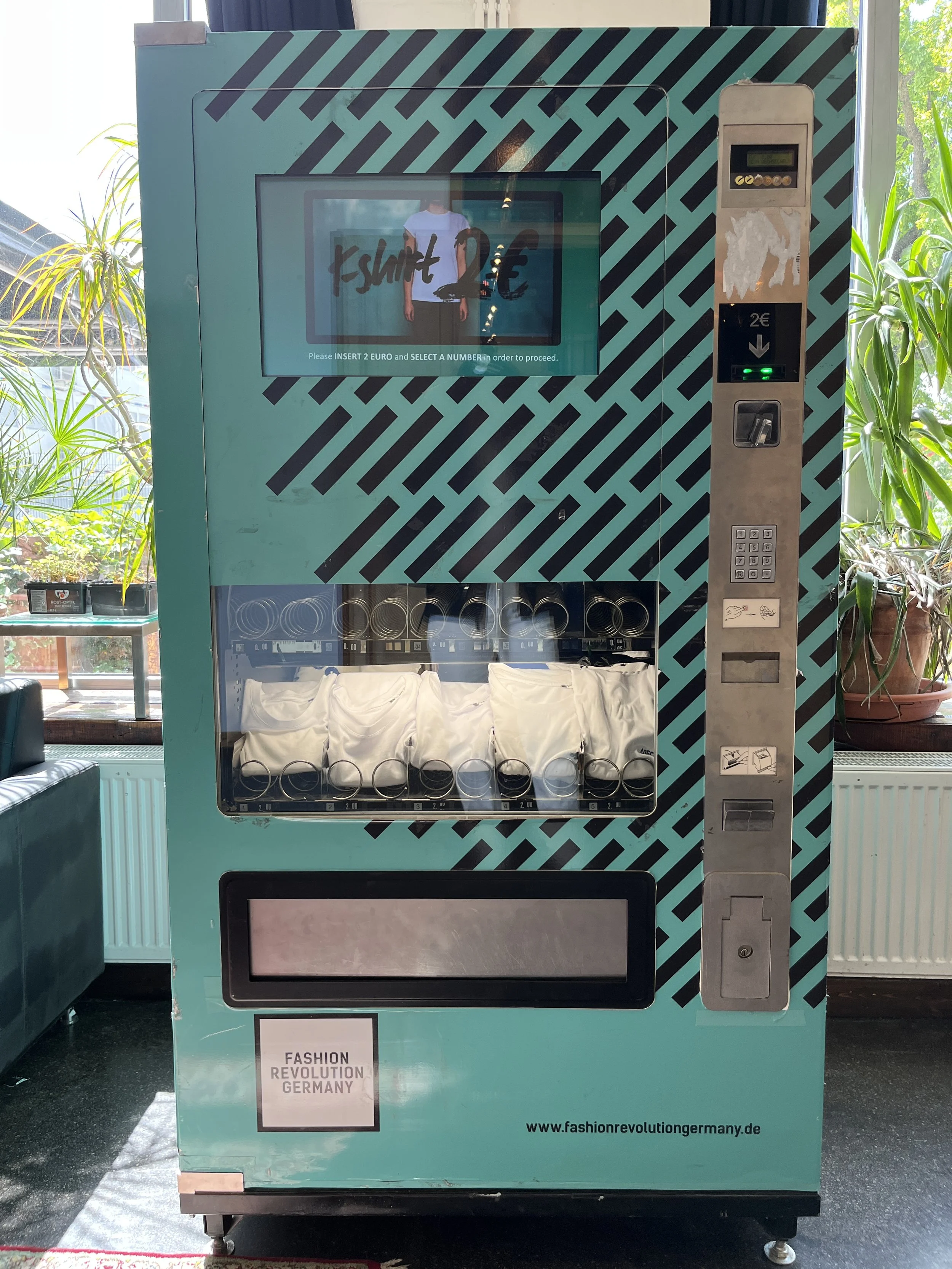Die Einsatzmöglichkeiten sind vielfältig, beispielsweise auf einer Messe, Festivals, in Bildungseinrichtungen oder für eine Firmenveranstaltung. Der 2€ T-Shirt Automat ist ein Anziehungspunkt auf jedem Event und unterstützt gleichzeitig die wertvolle Arbeit des gemeinnützigen Vereins Fashion Revolution Germany. – Individuelles Branding des Automaten möglich